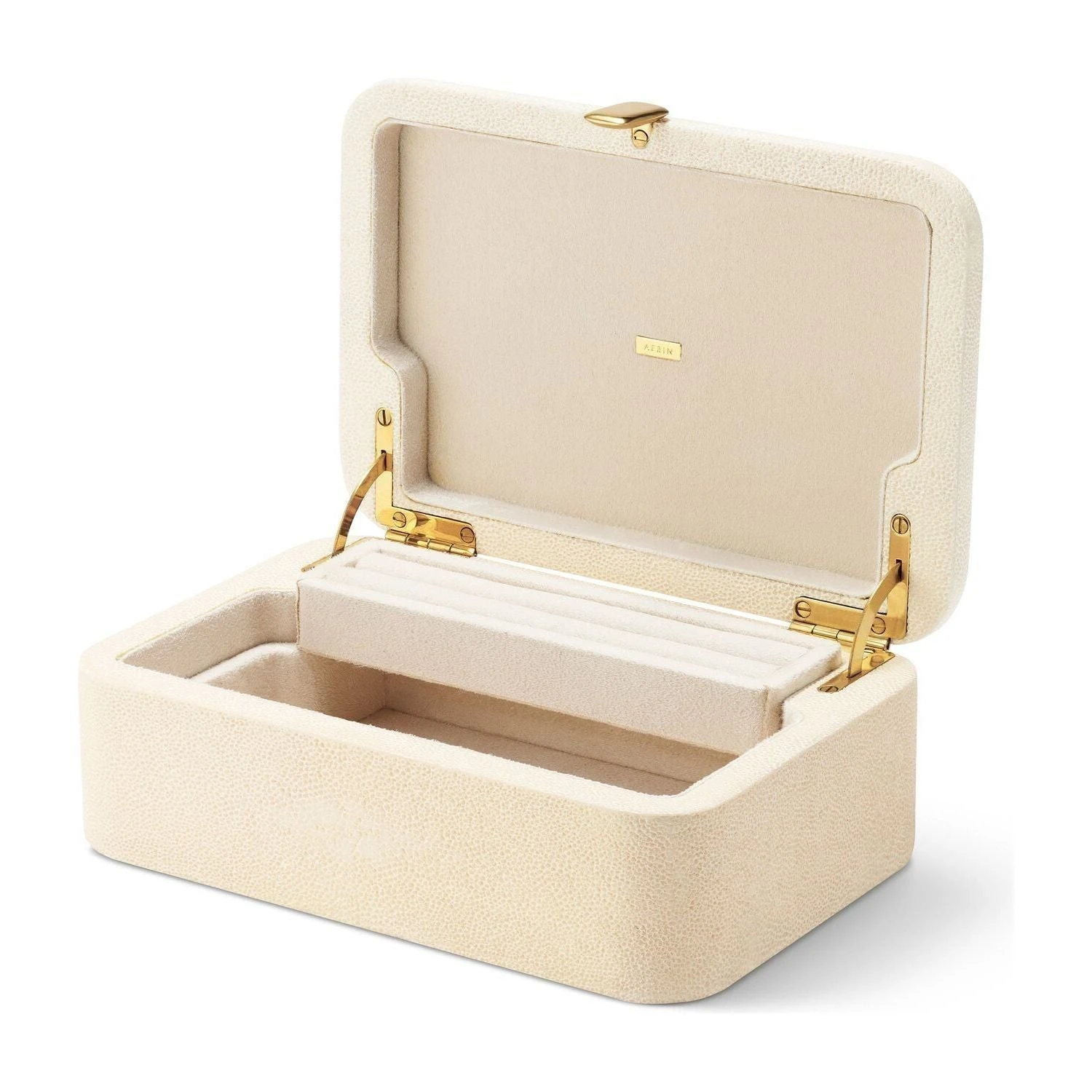 This decorative box has a luxurious shagreen finish and soft, curved lines, giving it a feminine look. Minimalist brass detailing adds a stylish touch. A removable tray increases options for its use, whether it is for jewelry on a vanity or organizing personal objects on a desk