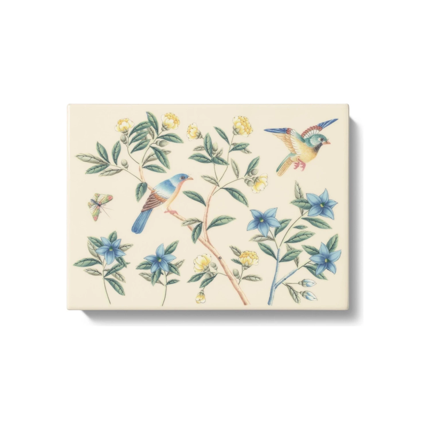 A favourite of Aerin’s, the legacy brand Gracie has been creating exquisite, hand-painted wallpapers since 1898. AERIN and Gracie’s shared love of heritage and craftsmanship led to a collaboration featuring Gracie’s Heathcote design, a hand-painted scene combining flowering trees and bushes as well as butterflies and birds. The collection includes this lidded box with a smooth lacquer finish, enhanced with details from the Heathcote scene. A luxurious suede interior keeps small pieces of jewelry safe and organized. The box provides a fresh look that works in both contemporary and traditional interiors and is a perfect addition to a vanity.