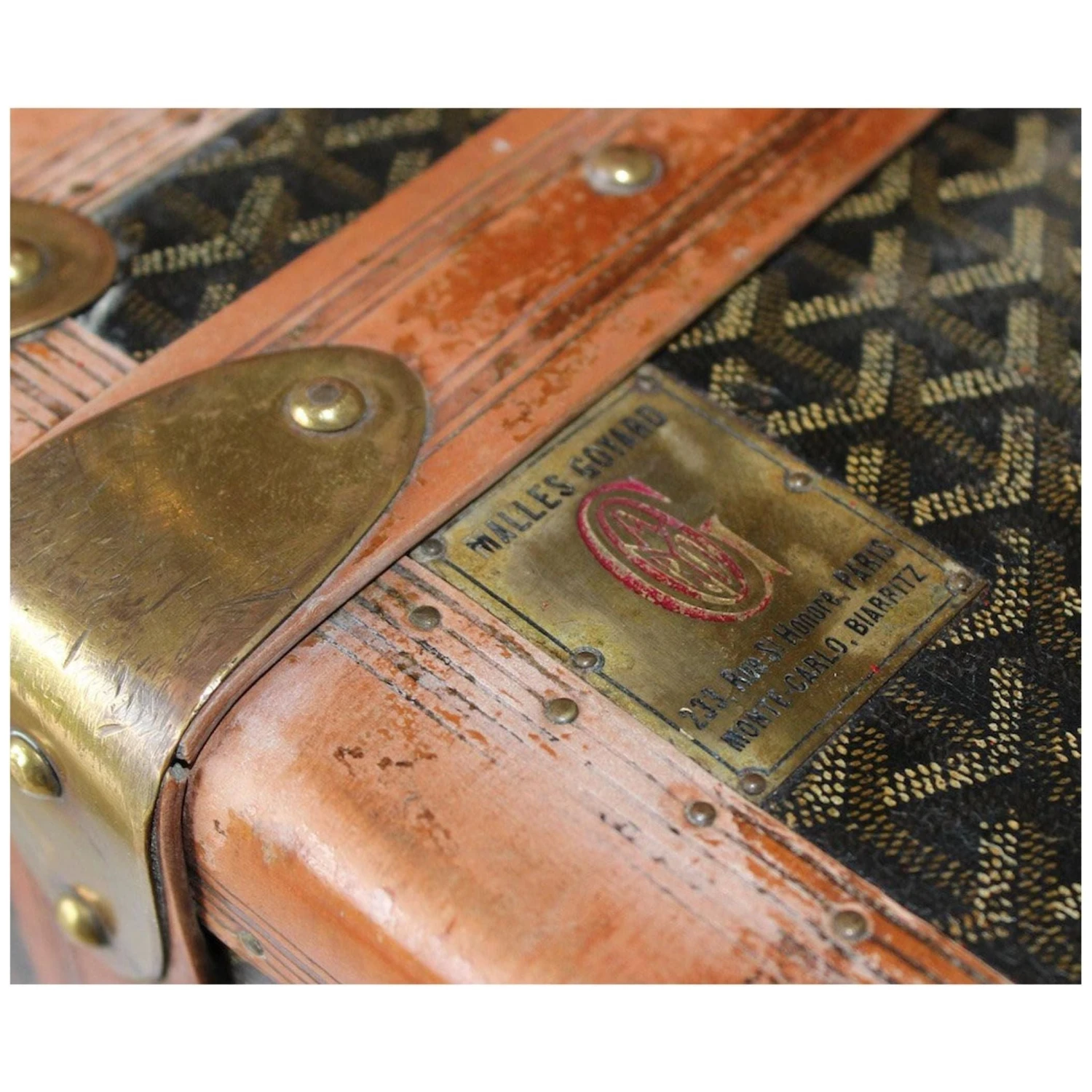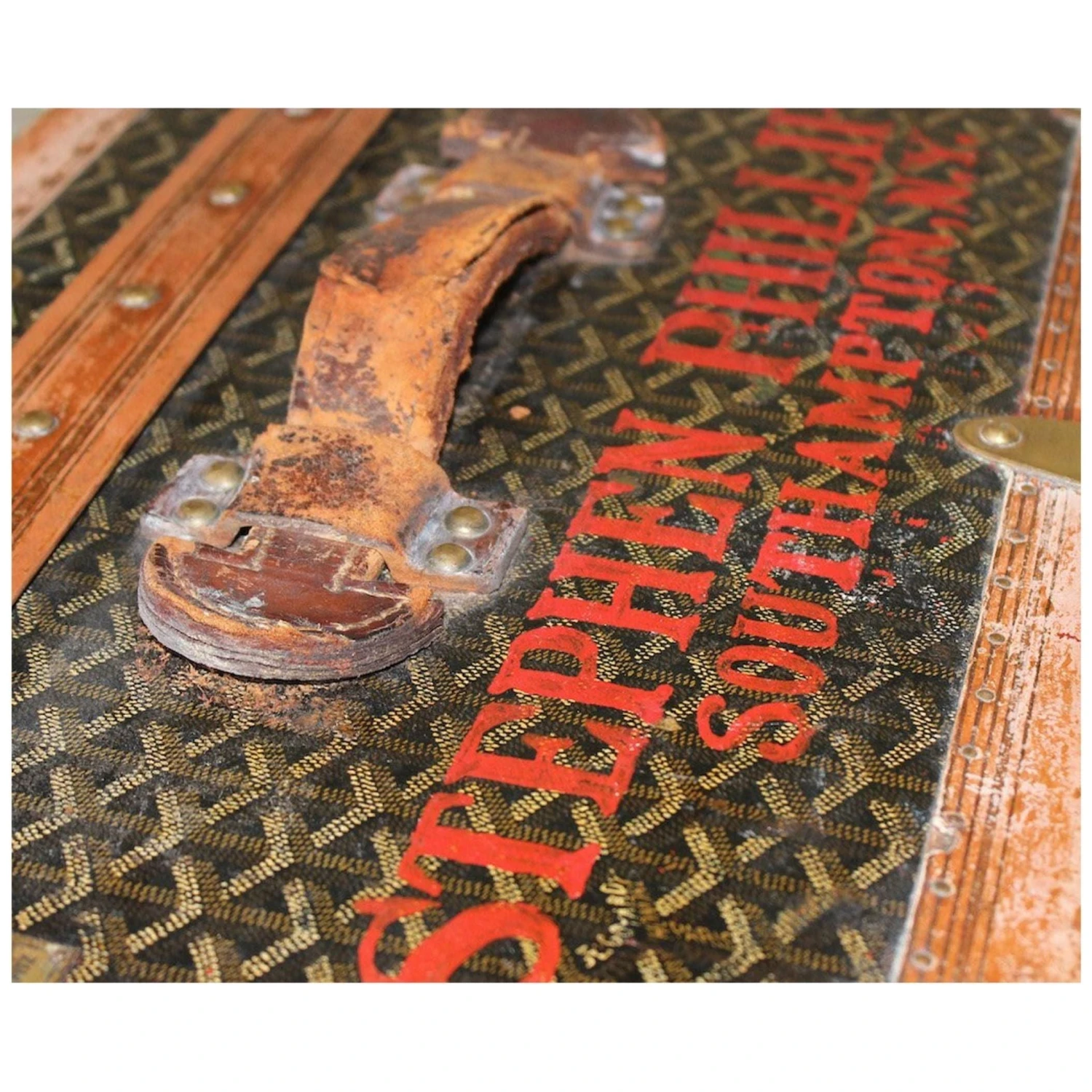Beautifully crafted Goyard cabin trunk circa 1920’s, this stunning trunk would make a statement in any fashionable home, finished in the traditional Goyard print and brass hardware finished in a tan leather edging this is a true collectors item.