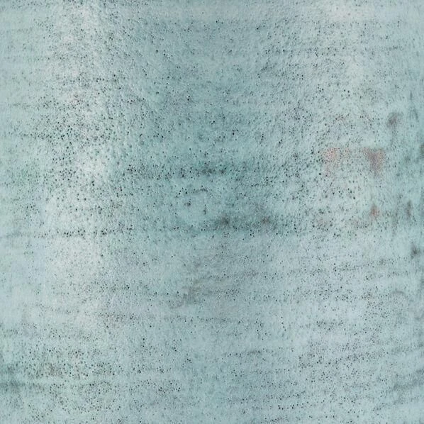 This low, round vase has been enhanced using a glazing technique that provides a textured, natural appearance, giving it an overall artisanal appeal.