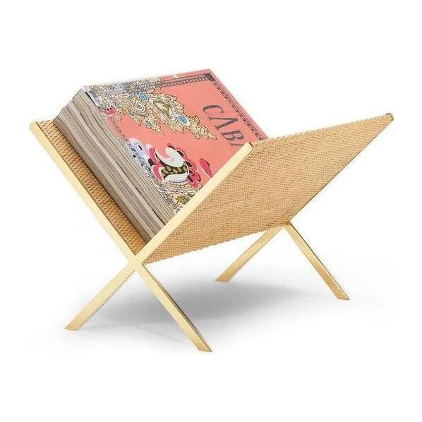 The combination of natural texture and the warmth of brass elevates this piece, offering an organic elegance that enhances a room, while also providing an effortless solution for organizing magazines.