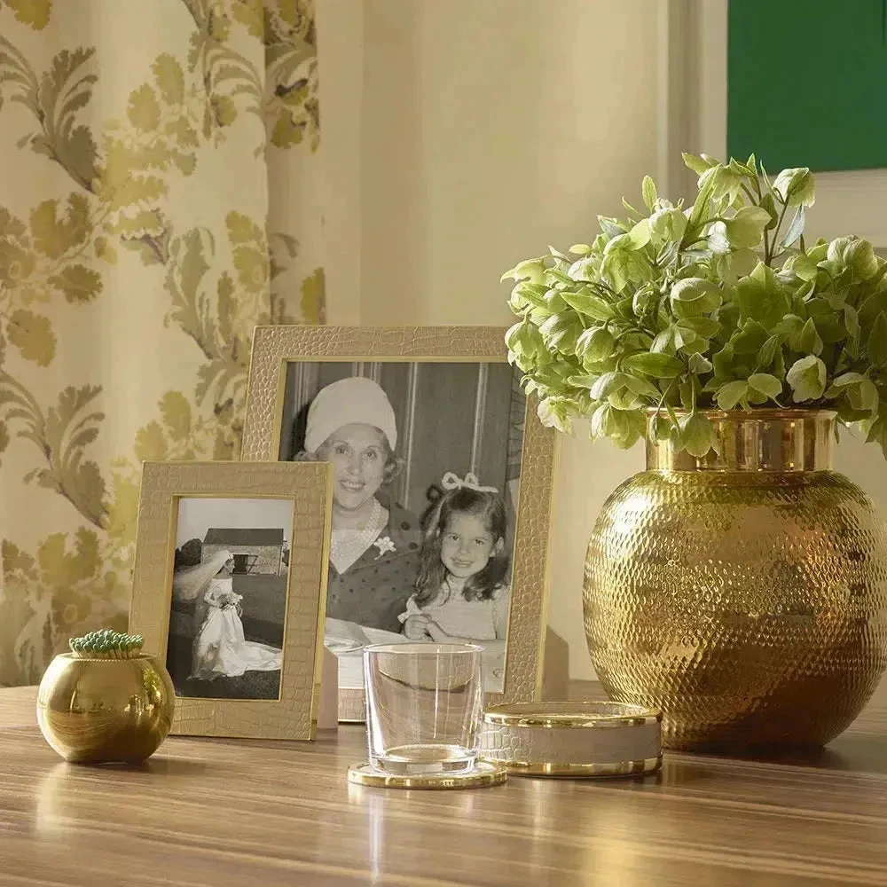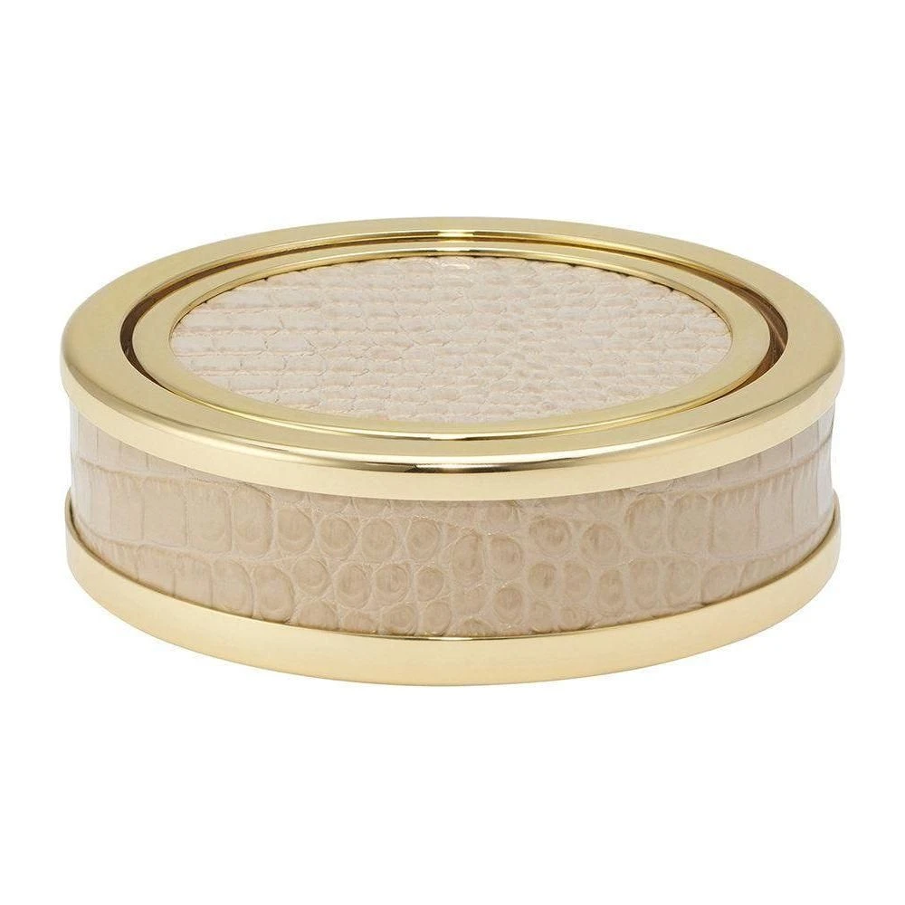 With four coasters included, this set has been embossed with a crocodile skin-style finish, suede underside and ringed in rich gold-toned brass. A stylish addition to entertaining, these coasters also make a great gift idea for any occasion.