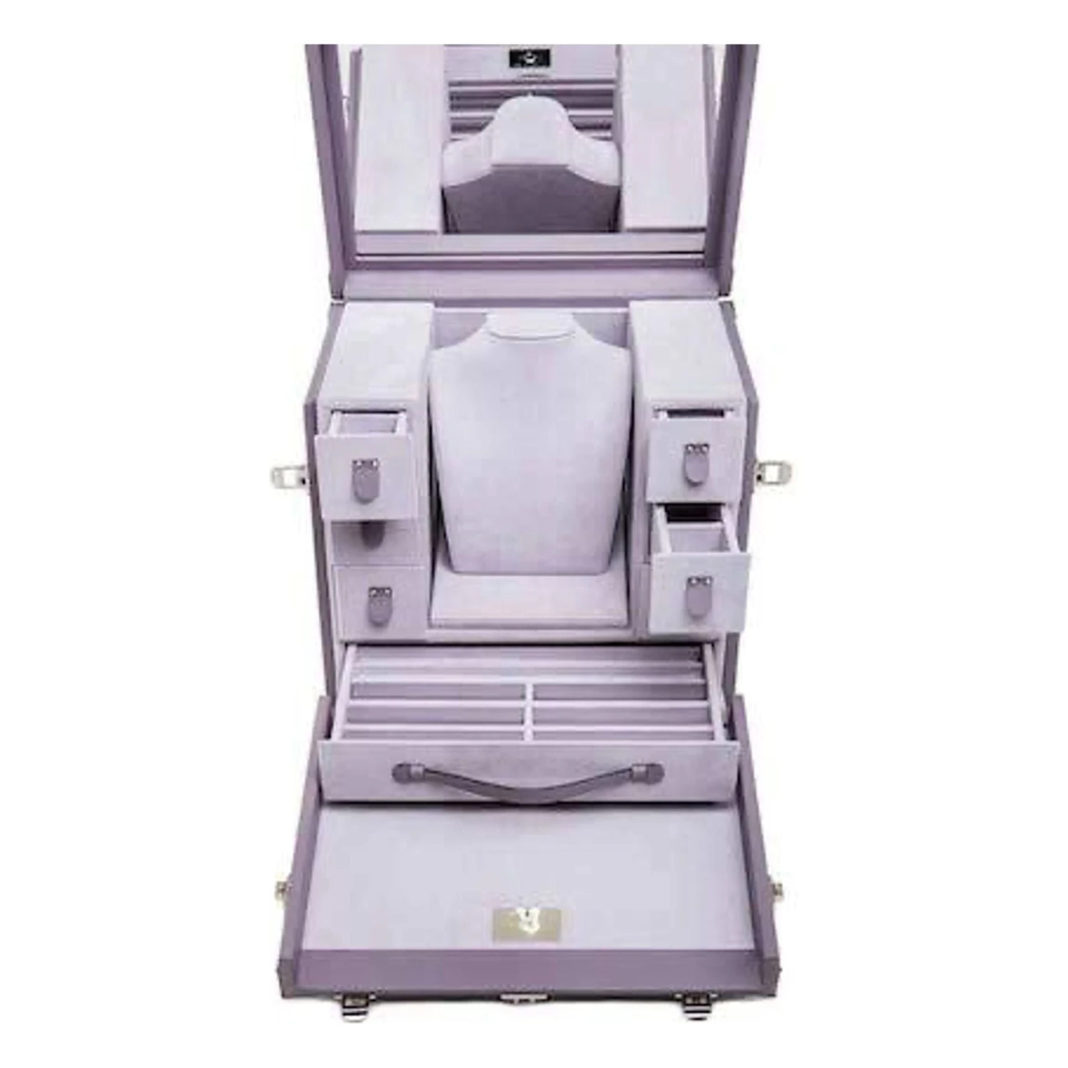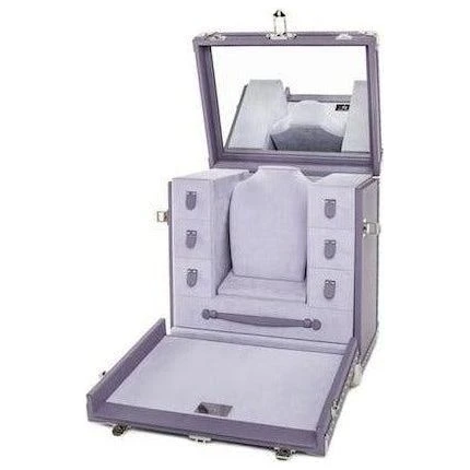 The exterior of the trunk is covered with fine Lilac leather, solid palladium hardware and microfibre suede interiors.