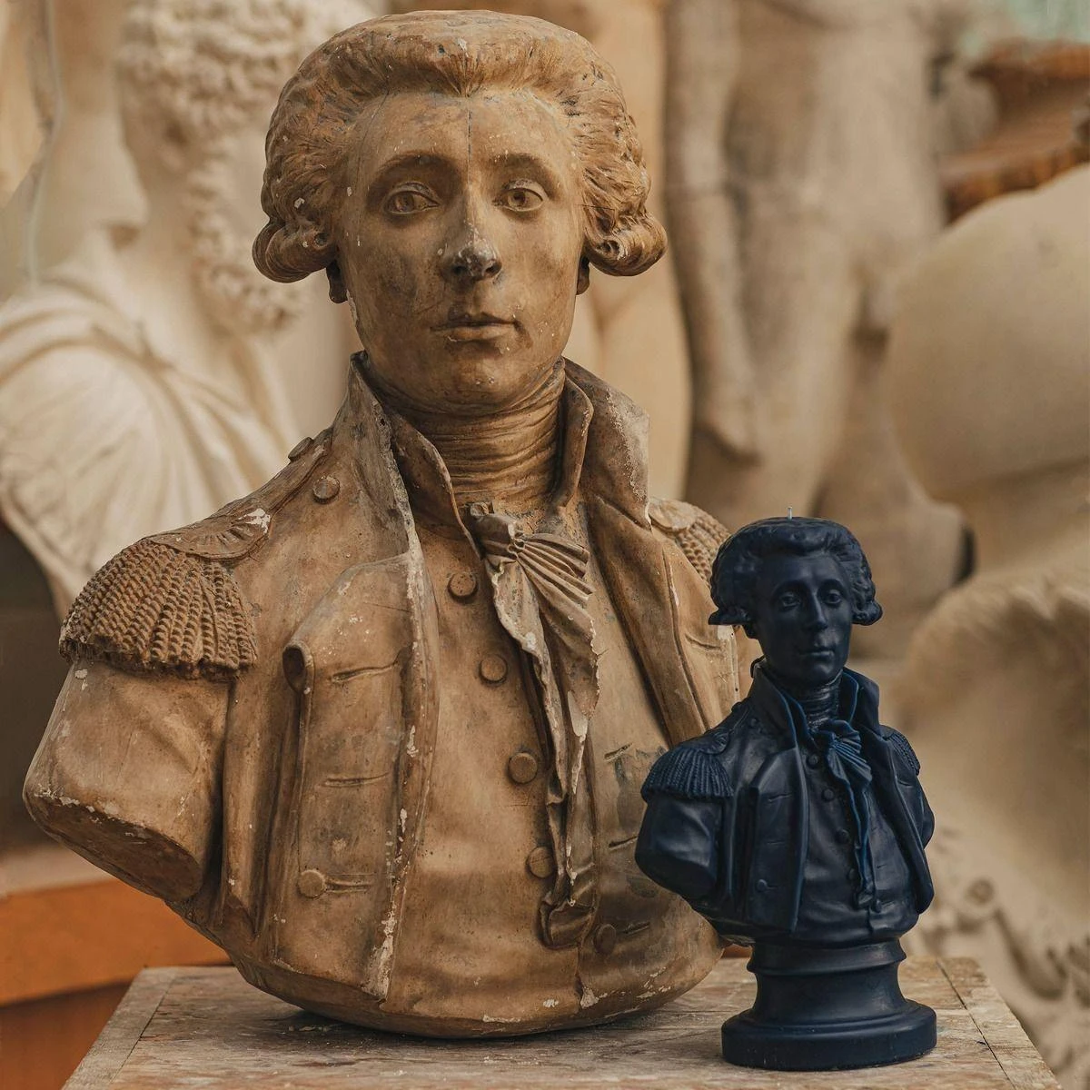 Sculpted in 1790 by Jean-Antoine Houdon, the famous bust shows Lafayette’s noble profile at the height of his career and influence.
