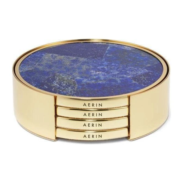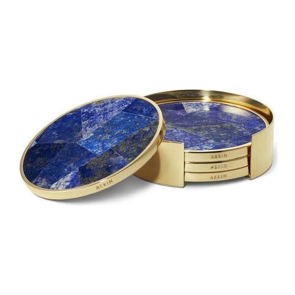 Topped with semi-precious blue stone arranged in a traditional mosaic design, and edged in warm gold, the four coasters can be stored in an attractive circular gold case. The Lapis coasters were inspired by the rich colors of European mosaic stone and tilework.