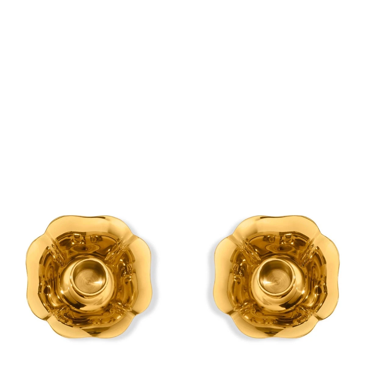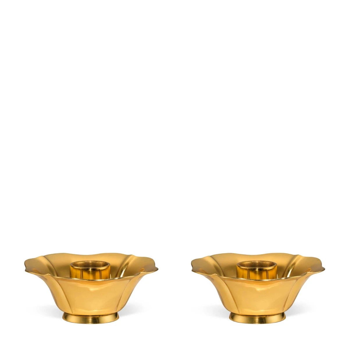 Inspired by a vintage bowl shape and Art Deco Design, this set of two brass candleholders is crafted in a stylized flower shape. An effortless way to add elegance and character to a dining table or fireplace mantel.