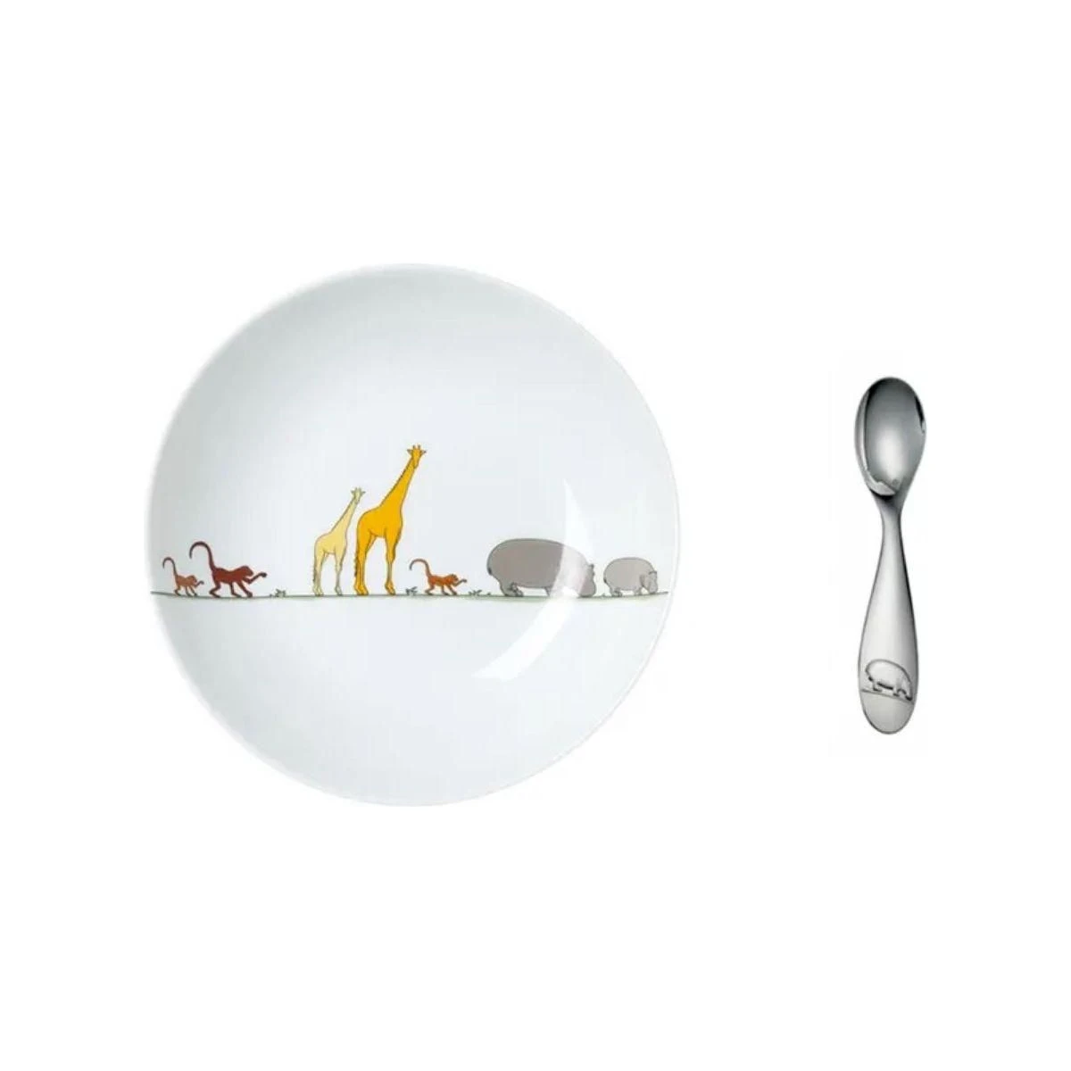 Turn mealtime into an adventure with the Savane cereal bowl and spoon set. Colorful animals trek across the porcelain bowl while the silver-plated spoon is adorned with a curious hippo on its handle. Make this set extra special. We invite you to engrave the spoon with a name, significant date, or heartfelt message. Giraffes and hippos and monkeys, oh my! Savane evokes wanderlust and curiosity with its safari animal motifs making it the perfect baby shower or christening gift.
