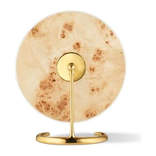 Inspired by Scandinavian design, this circular vanity mirror has a stylish curving edge, a swivel hinge, and an arching brass base.