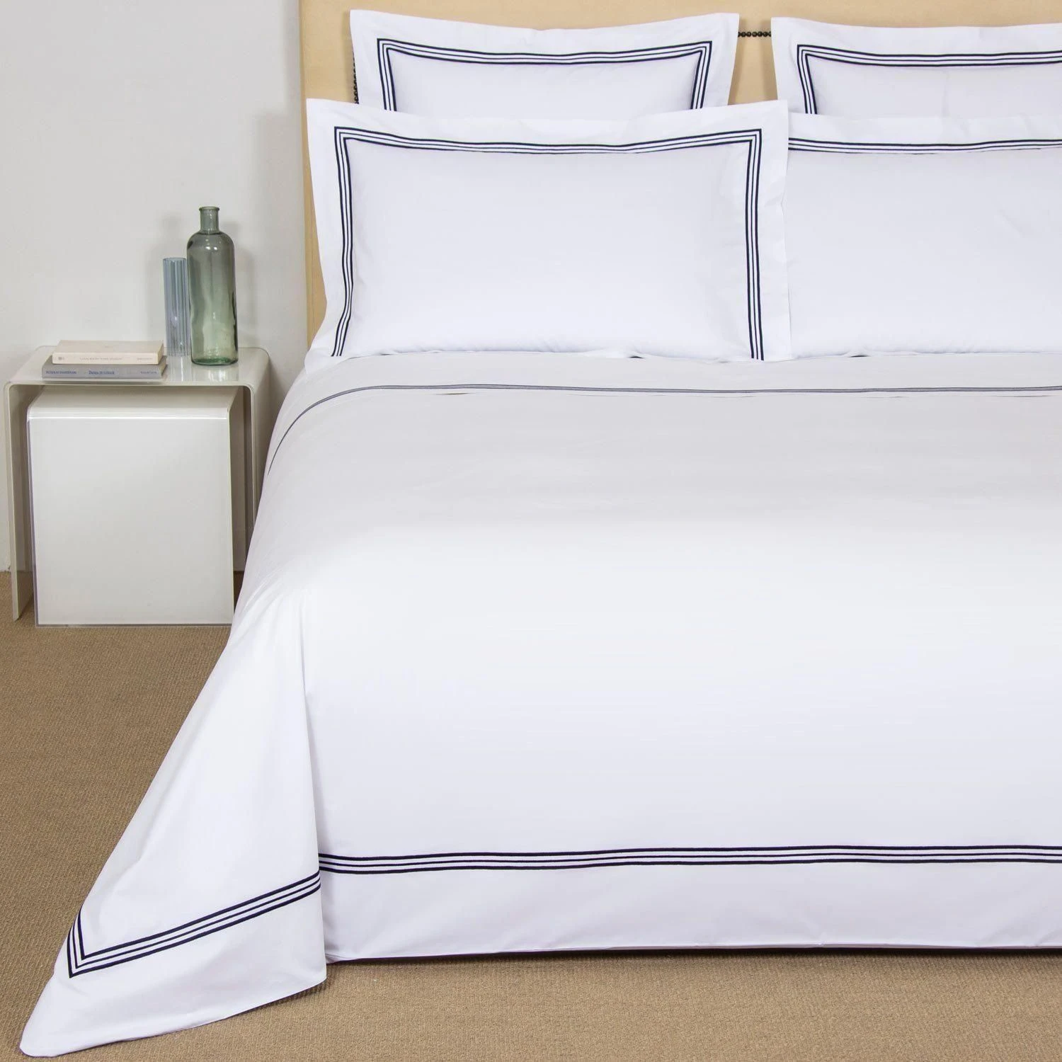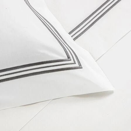 Soft and smooth with high shine, the Triplo Bourdon Duvet Cover is crafted from pure cotton poplin and embellished with a three-line embroidery.