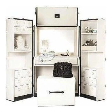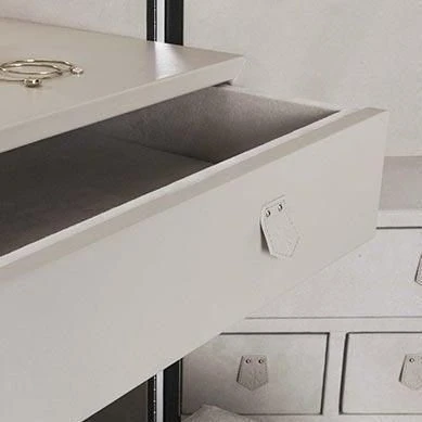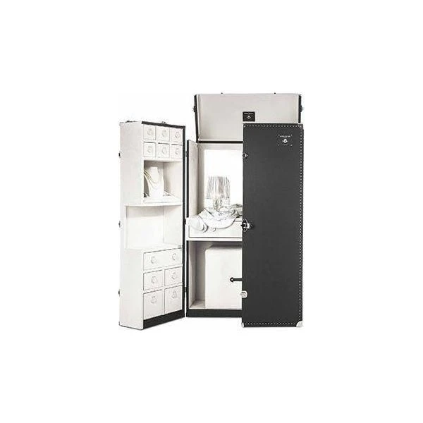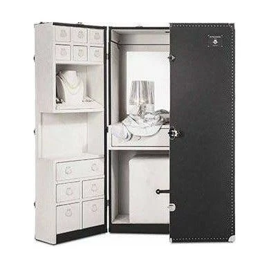 Venice embodies high Italian culture and elegance. It inspired the Venezia trunk, an elegant locking ladies’ dressing table for cosmetics, jewelry, and personal items. The exterior of the trunk is covered with fine leather, solid brass hardware, and approximately 2,000 hand-hammered tacks along the edges. The interior is divided into three sections: the central section features a desk and a wide mirror along with a concealable cable conduit and a soft-closing drawer. The side sections boast a jewellery case, a make-up compartment, and a series of storage drawers.